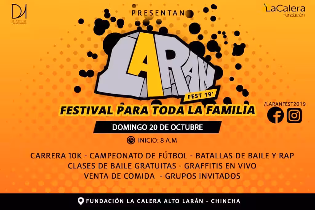 El Festival se desarrollará este 20 de octubre en las instalaciones de Fundación La Calera, ubicada a una cuadra antes de llegar a la empresa Prolan. El ingreso es totalmente libre y contará con actividades como: Carrera 10K, campeonato de fulbito, clases gratis de salsa, festejo y hip hop, batallas de baile y rap, feria gastronómica, graffitis en vivo, concierto en vivo, actividades para los niños y más.
